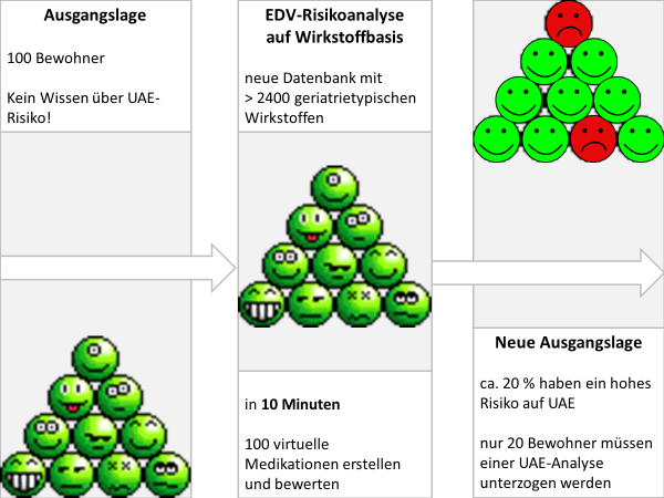 Ein nicht unbeträchtlicher Anteil aller Neuerkrankungen bei pflegebedürftigen Senioren basiert auf arzneimittelassoziierten Erkrankungen. Ihre Folgen sind sogenannte Unerwünschte Arzneimittelereignisse (UAE). So kann z.B. eine arzneimittelassoziierte Instabilität über Monate hinweg immer wieder und mehrfach Sturzereignisse auslösen. Oder eine arzneimittelassoziierte Inkontinenz führt ebenfalls zu Stürzen oder sogar noch zu weiteren Erkrankungen.