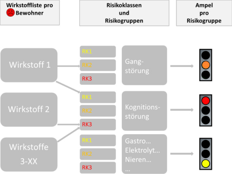 Als Grundlage der Risikobewertung nutzt VERIKO® die individuelle Medikation und die Symptombeobachtung der beteiligten Berufsgruppen und Angehörigen.